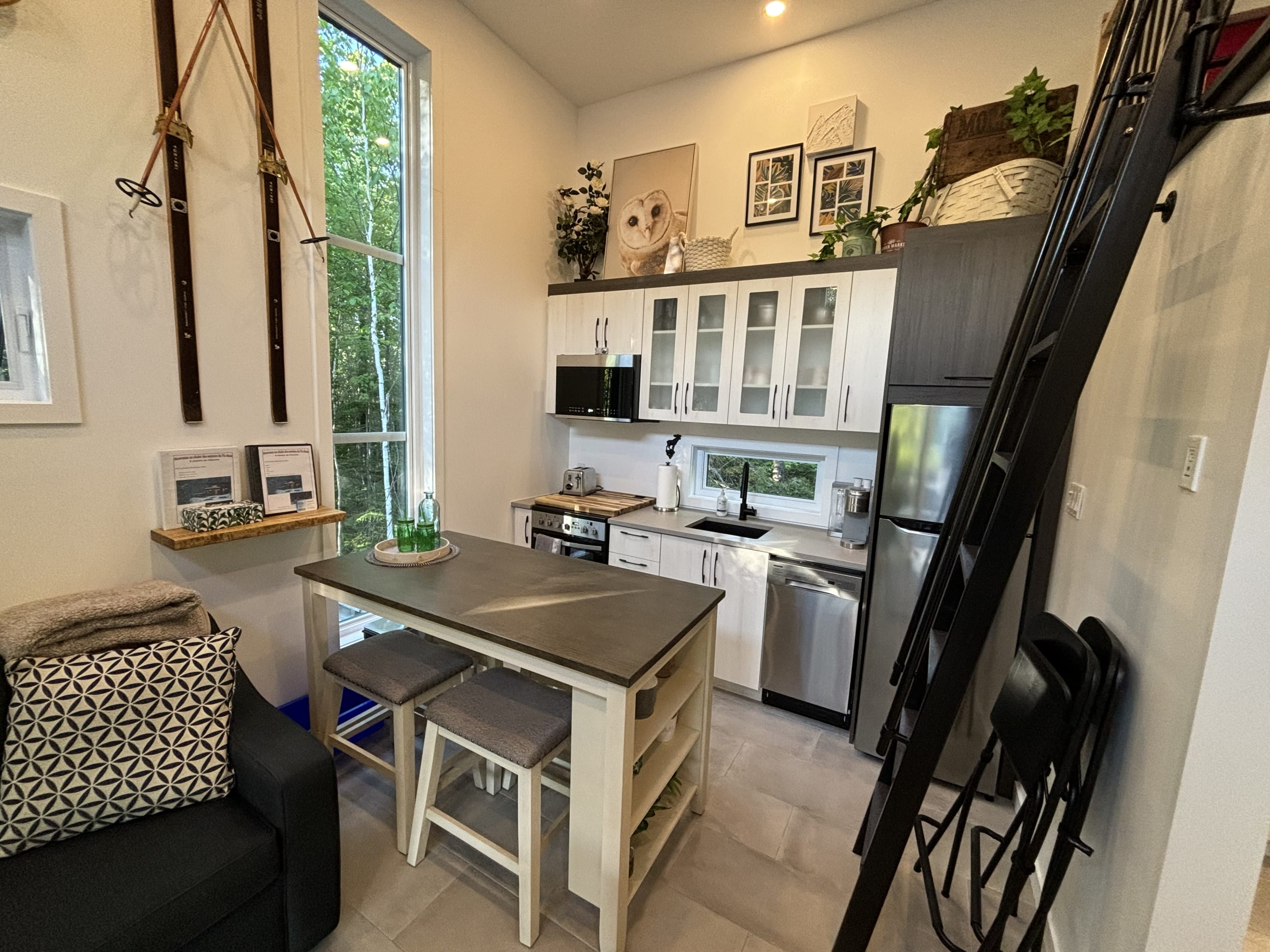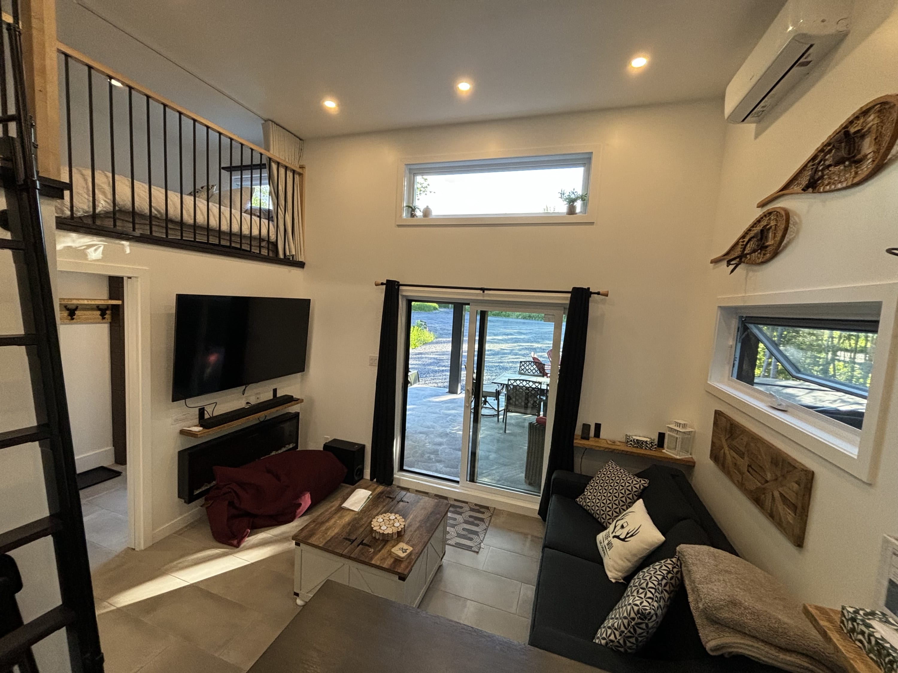 • Chambres et couchages : mezzanine avec 2 lits queen, salon avec 1 divan-lit double