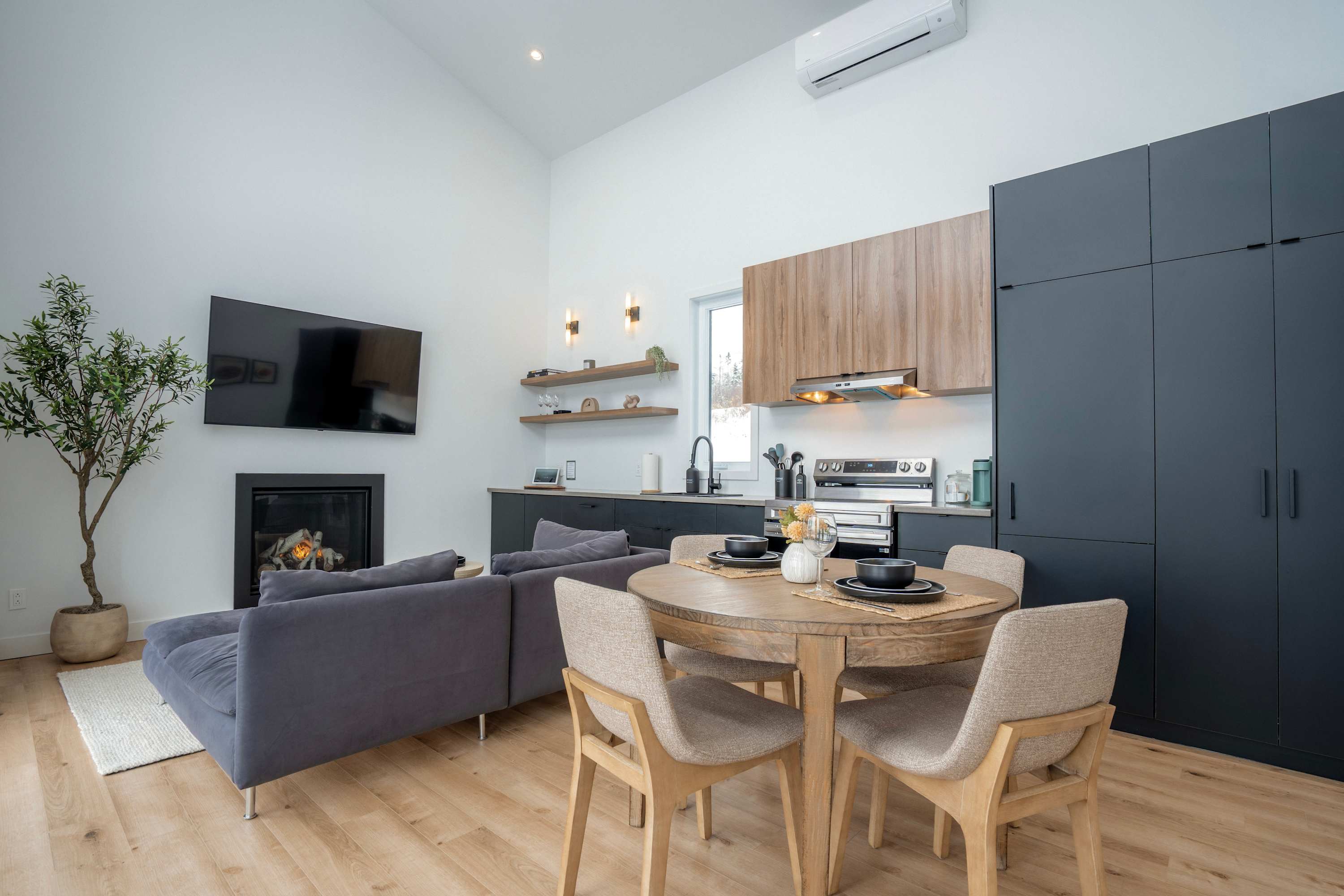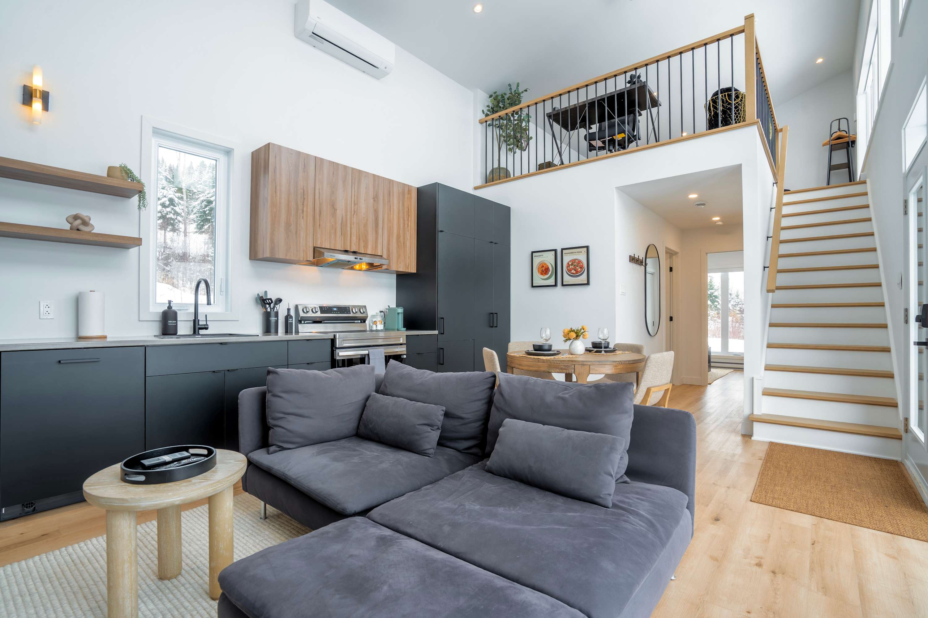 • Aire ouverte lumineuse : cuisine, salle à manger et salon avec divan-lit