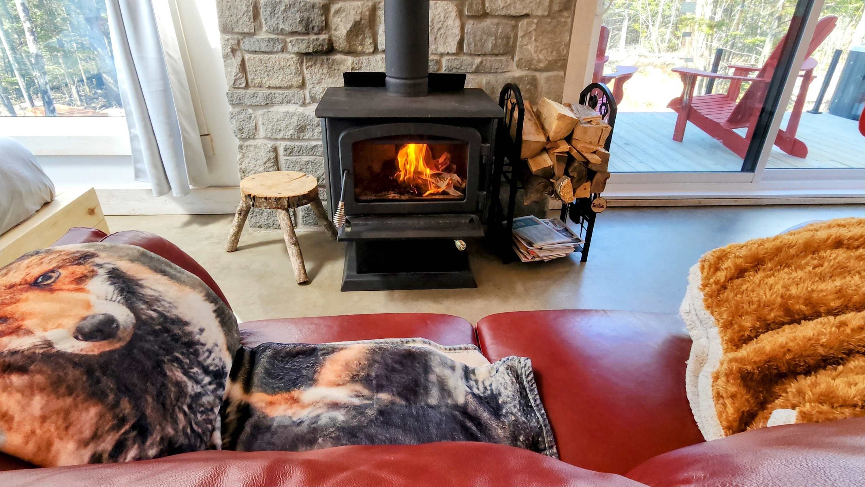 • 🔥 Poêle à bois et foyer extérieur (1 paquet de bois fourni, autres payables sur place à 10$)