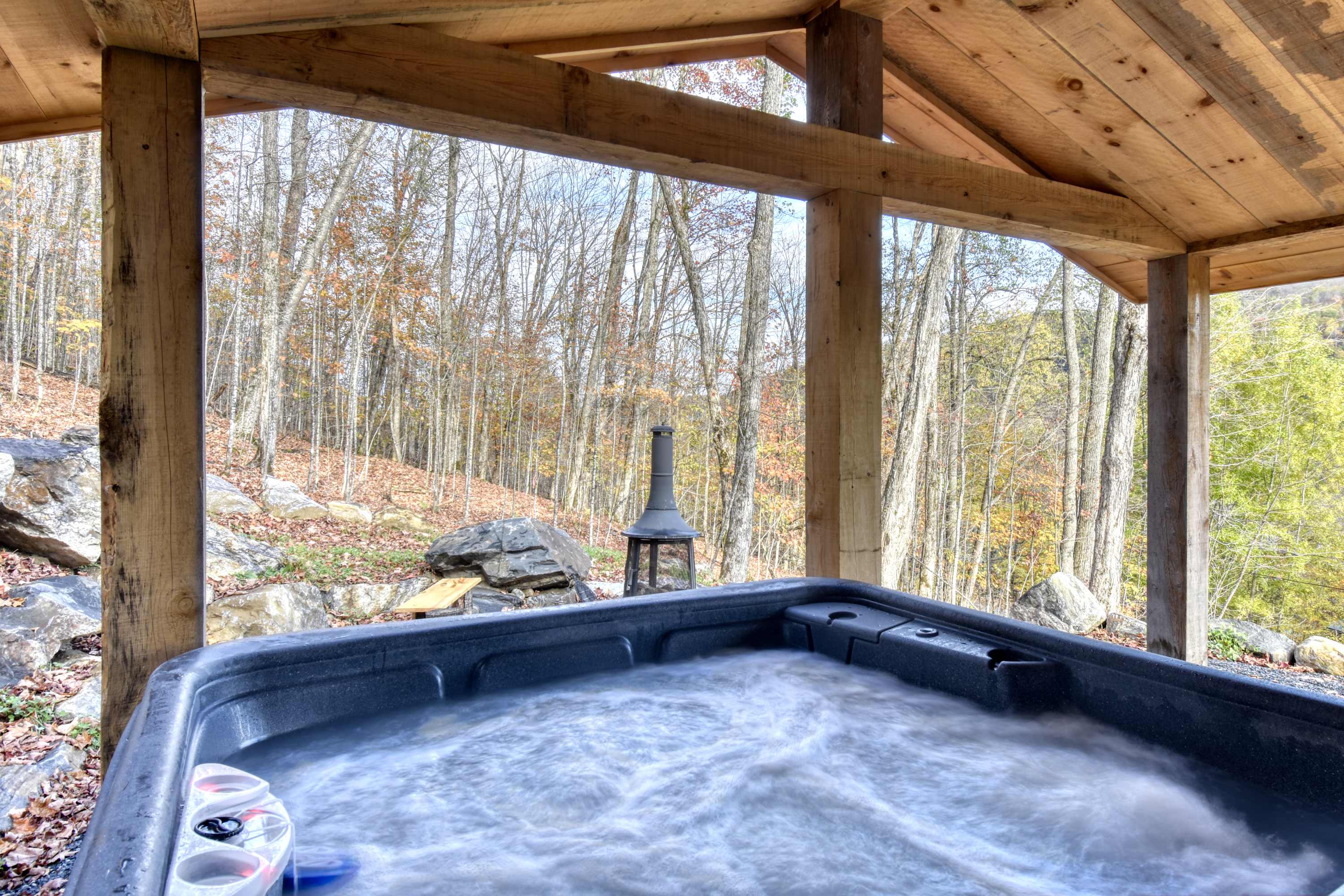 ✨ À l’extérieur, profitez d’un spa 4 saisons couvert et d’un espace feu aménagé, parfait pour vos soirées sous les étoiles.