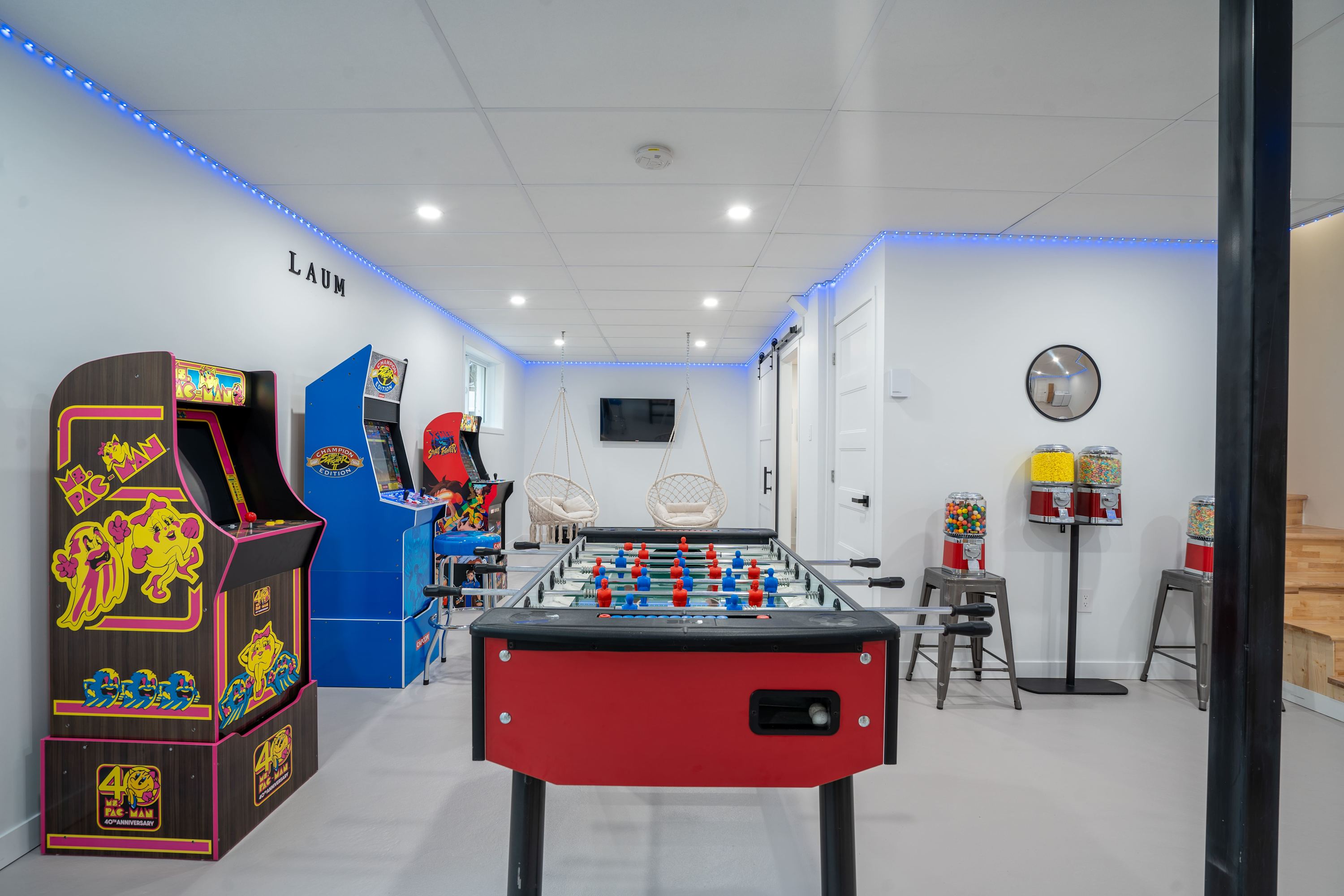 🎮 Entertainment basement with 3 arcade games, 4 candy machines, and a foosball table