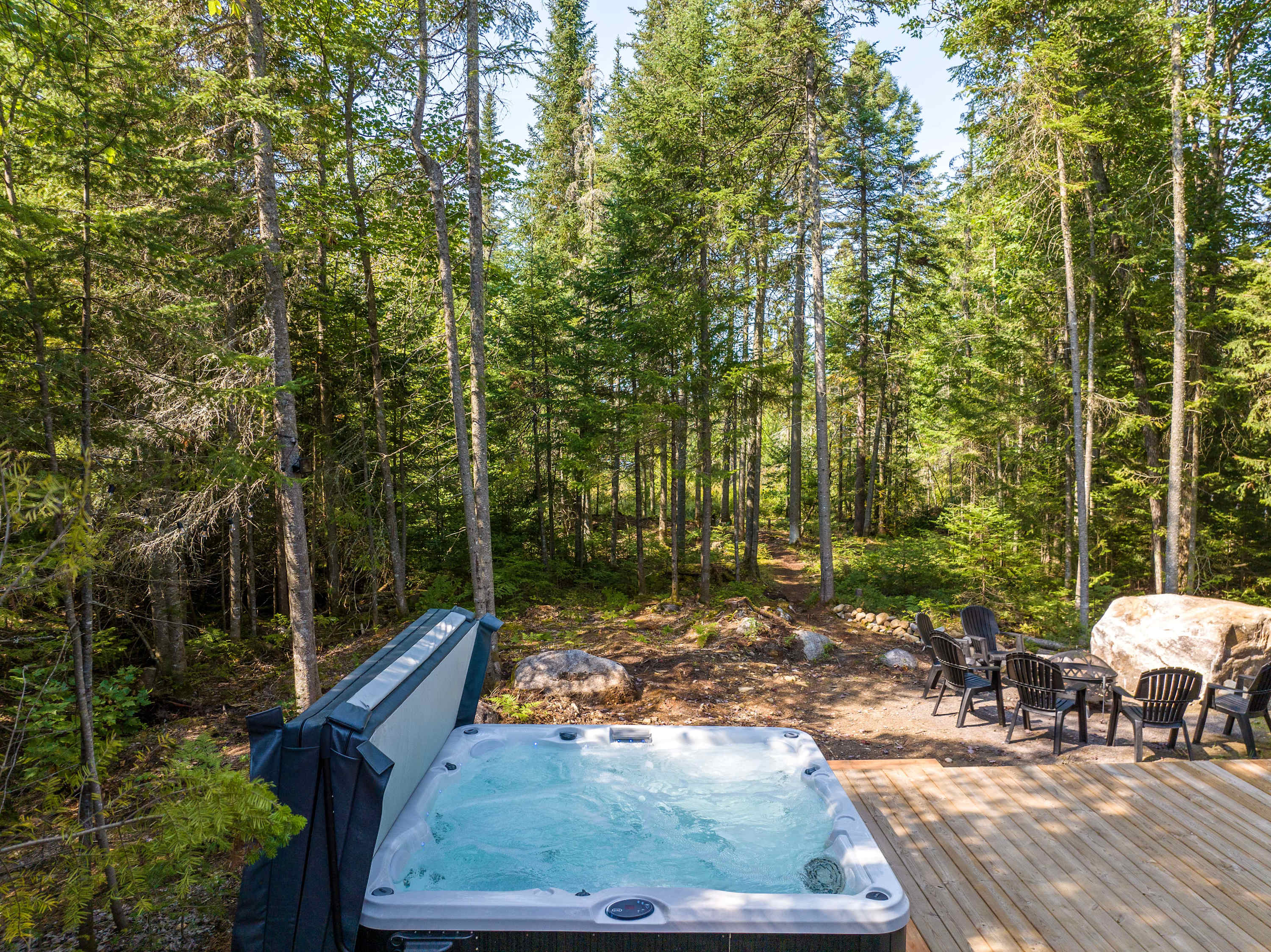 • Extérieur : terrasse avec spa privé, hamac, BBQ et espace feu.