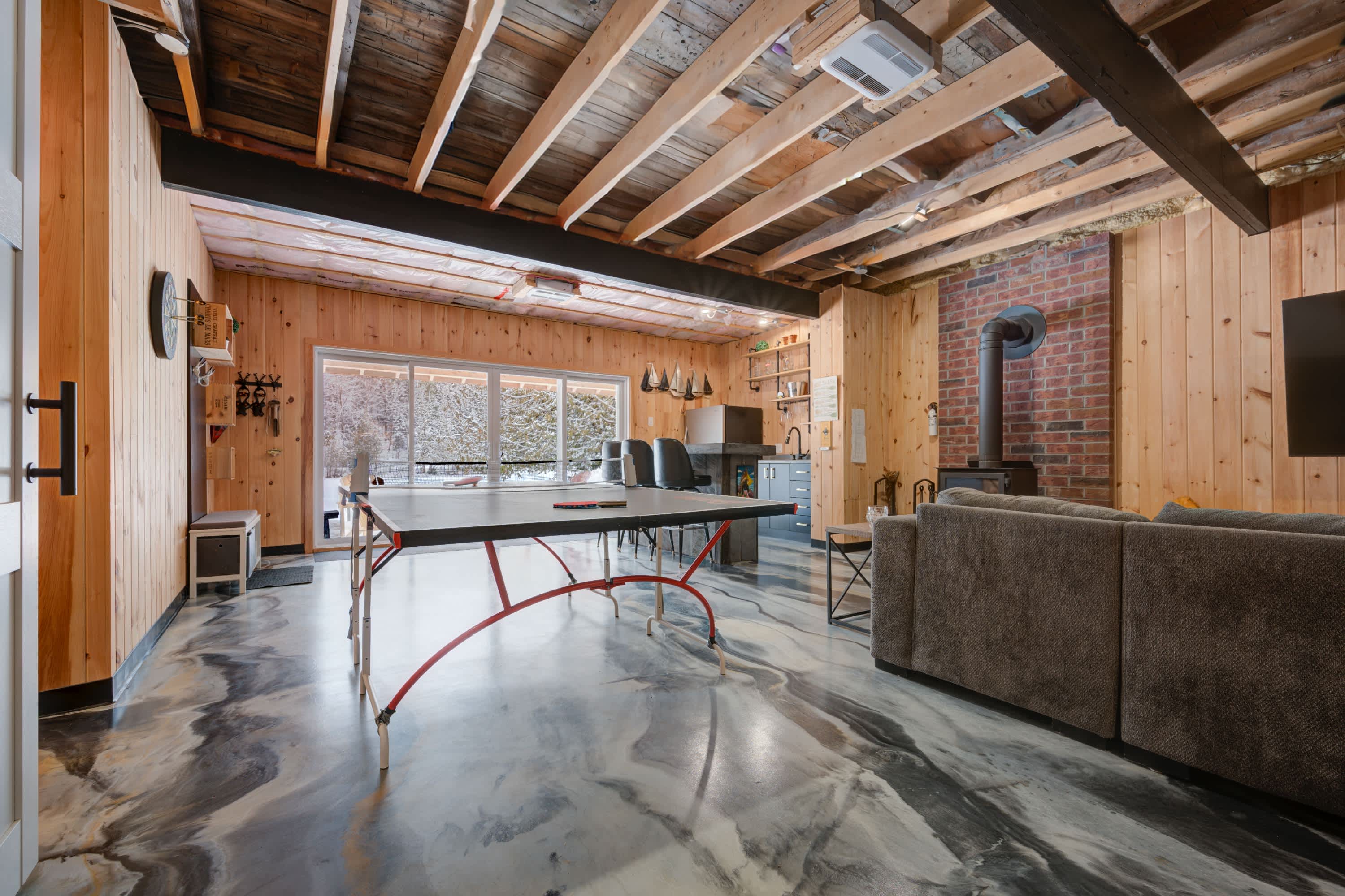 🔥 Open-concept living area with wood-burning stove (firewood not provided)