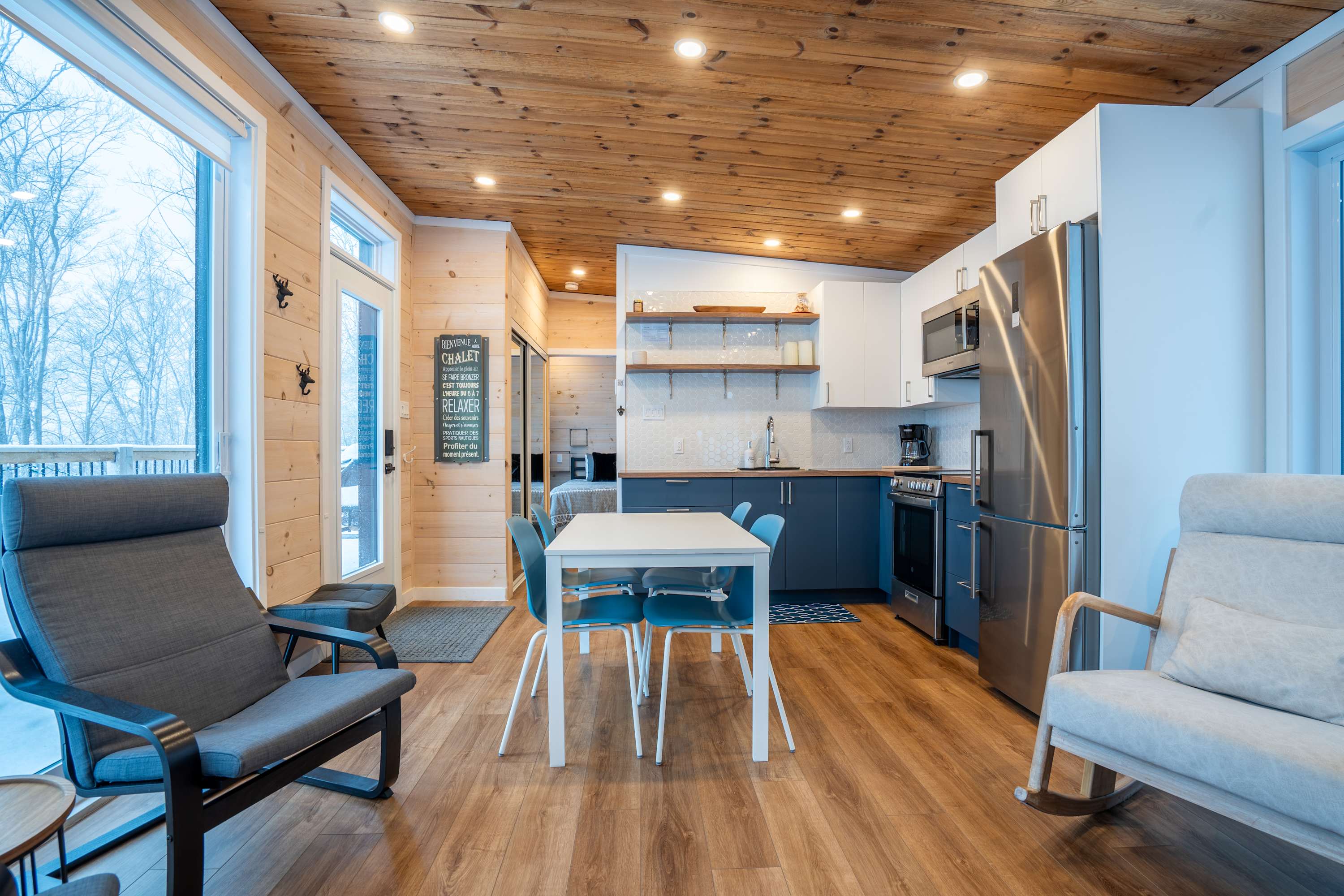 With its warm ambiance, large windows, and stunning views of the forest, it’s the ideal place to relax.