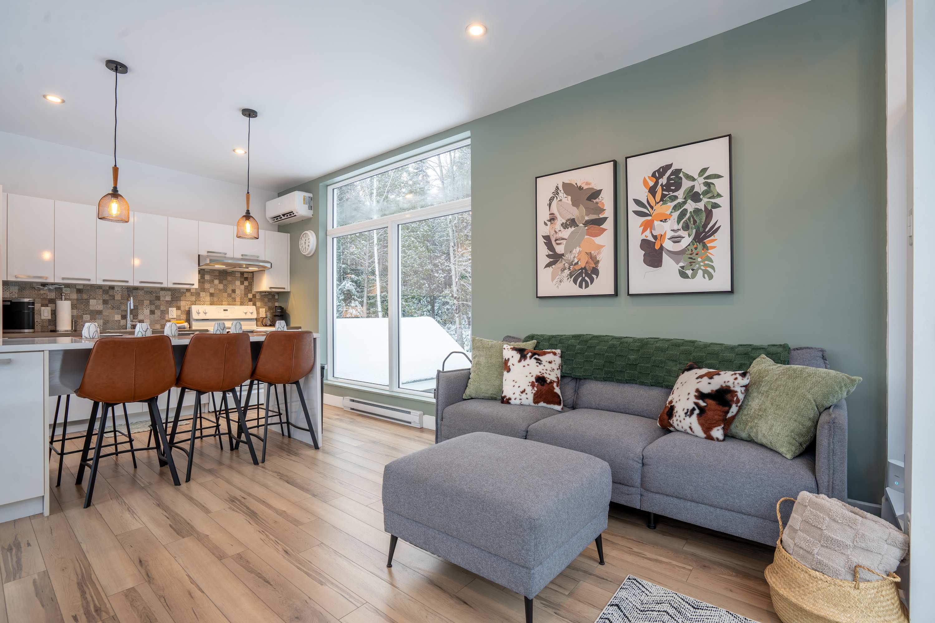 This modern and inviting chalet can host up to 8 guests and features a bright, welcoming living area thoughtfully designed for comfort all year round.