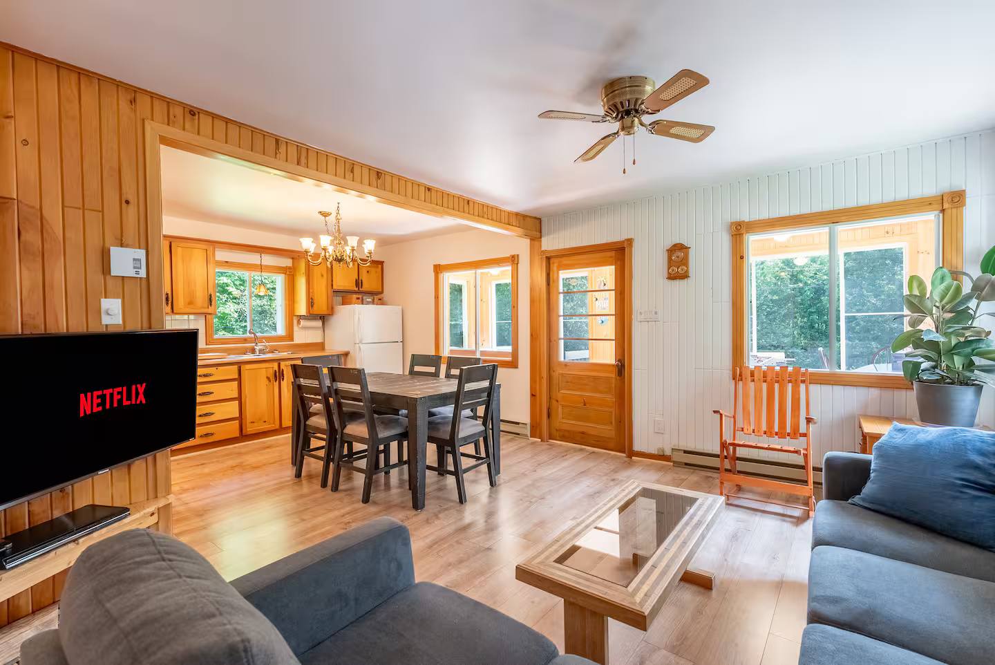 Guests have full access to the chalet and all amenities, including the hot tub, lake (with kayak), outdoor deck, and shared living spaces.