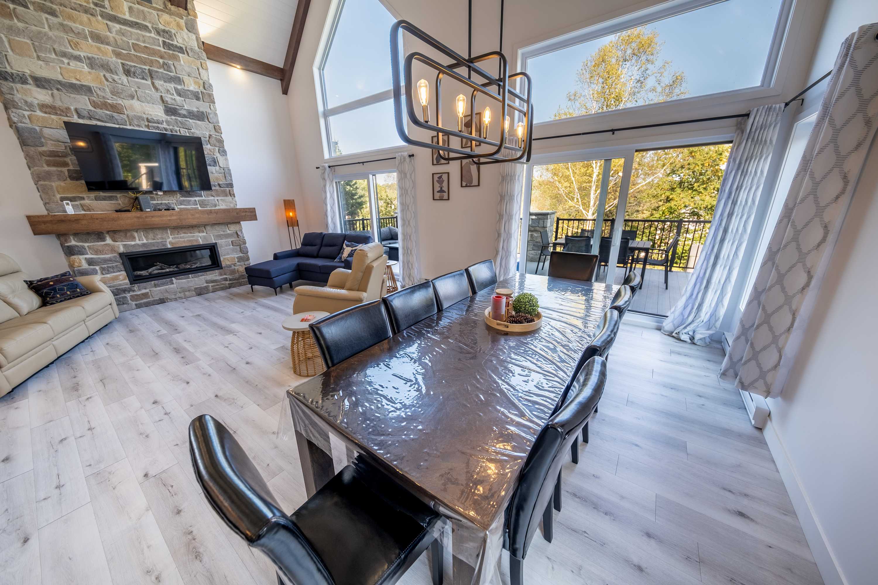 • Open-concept main area with living room, dining area, and fully equipped kitchen