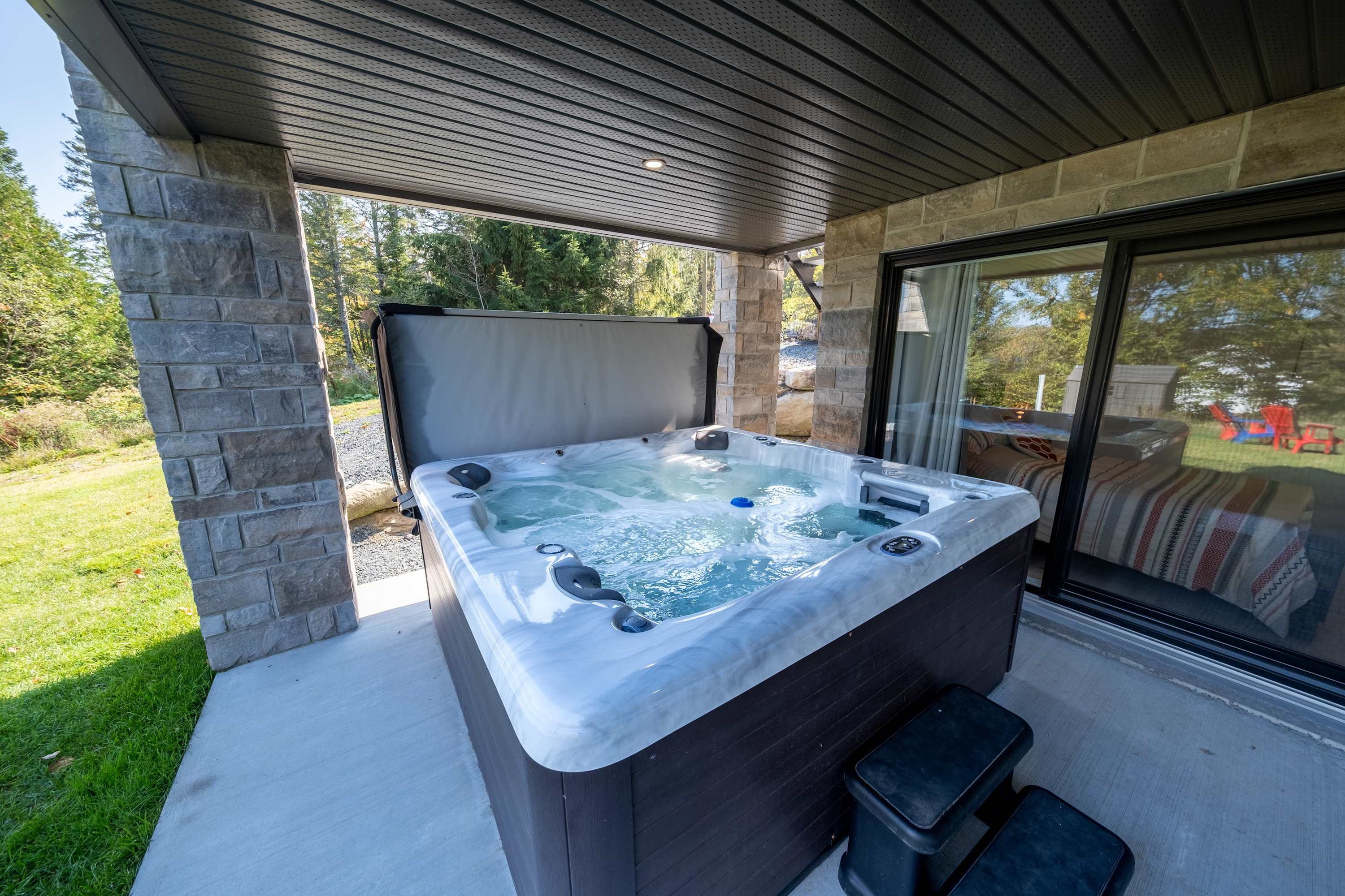 Guests have full access to the chalet and outdoor facilities, including the spa, terrace, and private yard.