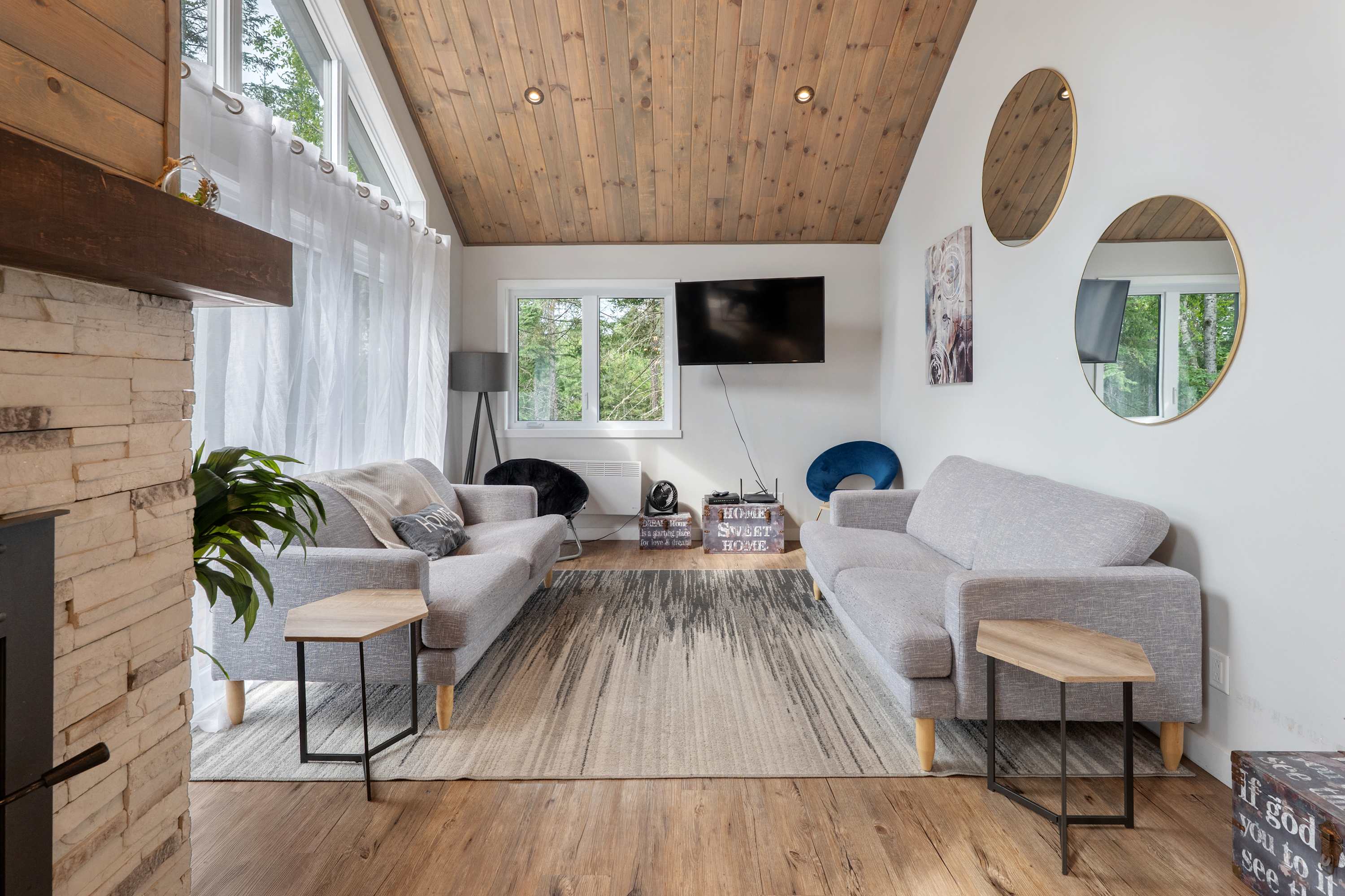 - Ground floor: Warm living room with fireplace, open-concept kitchen and dining area, full bathroom, and one bedroom with a queen bed.